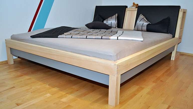 Zirbelkieferbett / Doppelbett mit Farblack Kopfteil als Stauraum Lederkissen