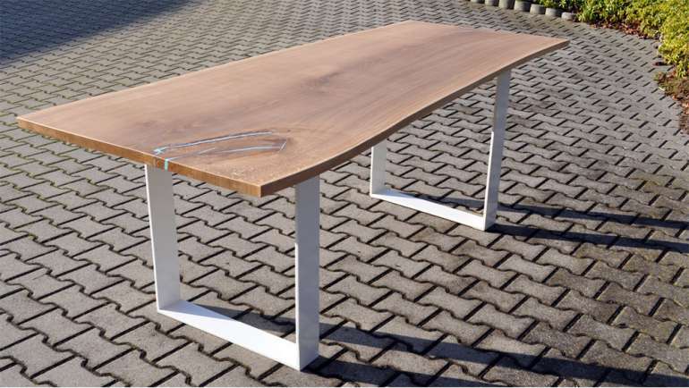 Tisch Asteiche mit Baumkante Stahlfüße weiß