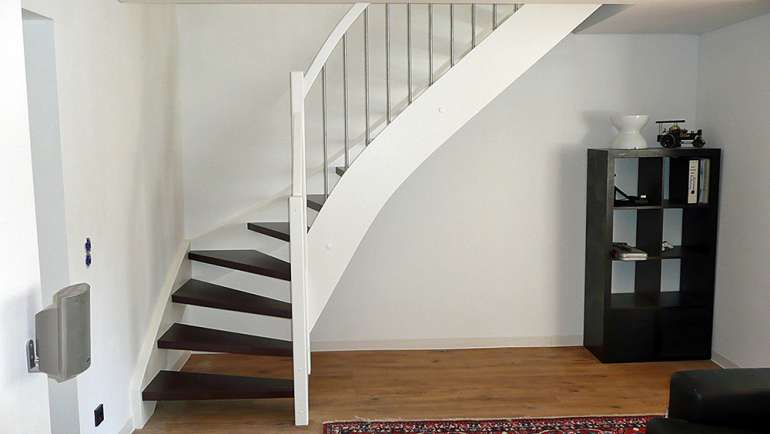 Treppe Buche Gebeizt Wangen weiß lackiert Edelstahl Sprossen
