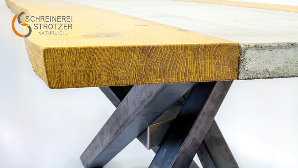 Oberfläche: Massive Betonplatte mit Asteiche eingefasst, Holz an Beton angesetzt, Tischgestell in Stahl