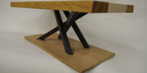 Bei diesem Tisch möchten wir zeigen, dass wunderbare Motive und Muster, durch den Wuchs des Holzes entstehen können. Man muss sie nur sehen. So würde ich die Platte mit dem Namen „küssende Elche“ bezeichnen. Durch das Spiegeln und Stürzen kann man der Natur freien Lauf lassen. Außerdem werden dadurch Ressourcen geschont. Die Ausbeute der schönen Oberfläche erhöht sich.