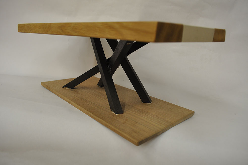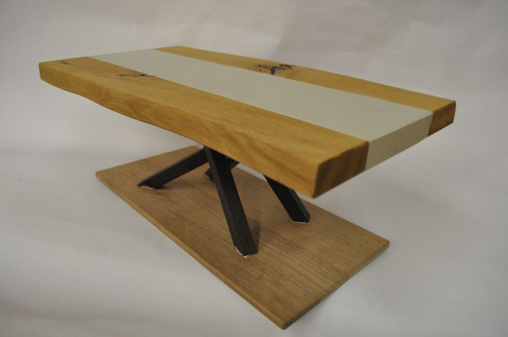 Beton erfreut sich immer mehr Beliebtheit. Für uns Schreiner bringt es den großen Nachteil vom Gewicht mit sich. Das Modell wurde mit einer Beton-Optik Platte gefertigt. Beim Original würden wir echten Beton verwenden. Für das Fußgestell haben wir Quadratrohre, Mikado artig angeordnet, vorgesehen.