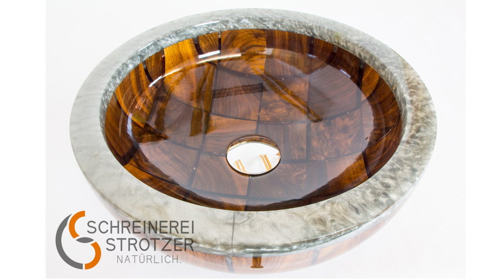 Holzwaschbecken in Amerikanischen-Nussbaum mit Epoxydharz gegossen mit rot-transparenter Fuge, rund Gedrechselt, Oberfläche Hochglanz