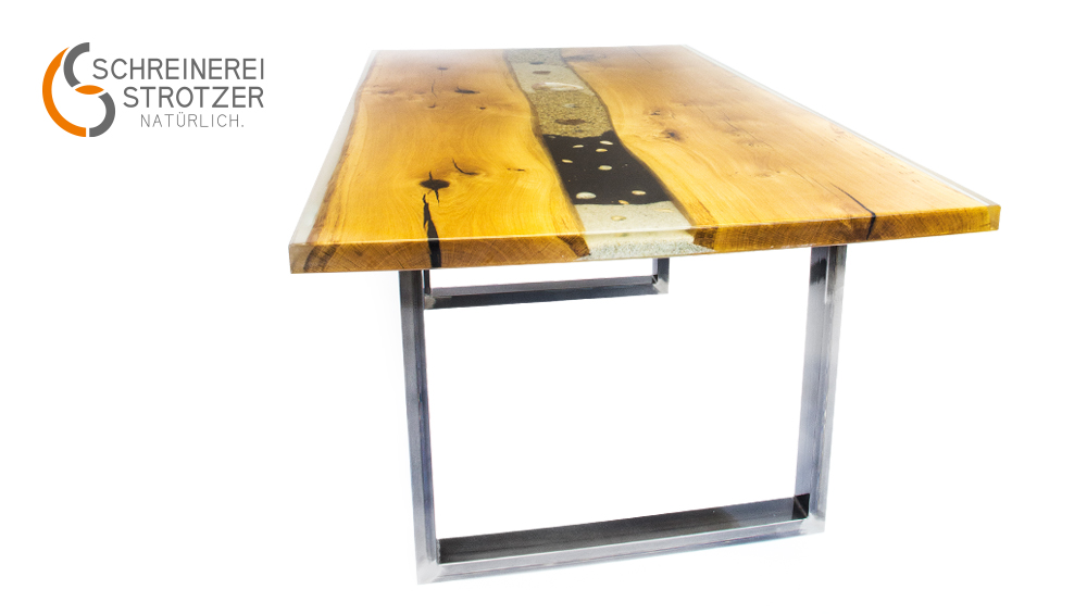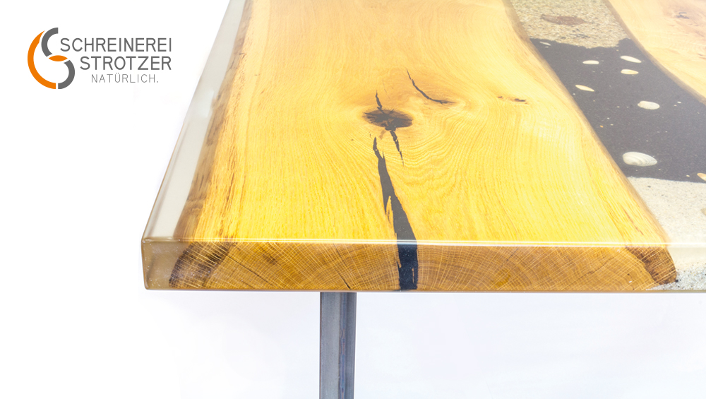 „Rivertable“ – Esszimmertisch aus Holz, Epoxidharz und Flussboden