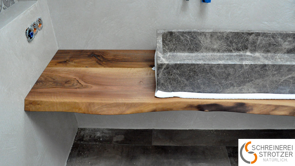 Die untere Ablage bietet Platz für Utensilien und Handtücher. Außerdem wird der Siphon etwas verdeckt. Das Becken wurde aus nassen Zwetschgenholz gedrechselt. Durch das Schwinden hat sie sich, wie gewünscht, leicht oval verzogen. So unterscheidet es sich von einem Massenprodukt. Es ist einzigartig. Beim Original würden wir möglicherweise auf Kirsche, oder Nuss ausweichen, da uns derzeit leider keine Zwetschge in der Dimension zur Verfügung steht.