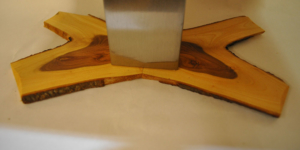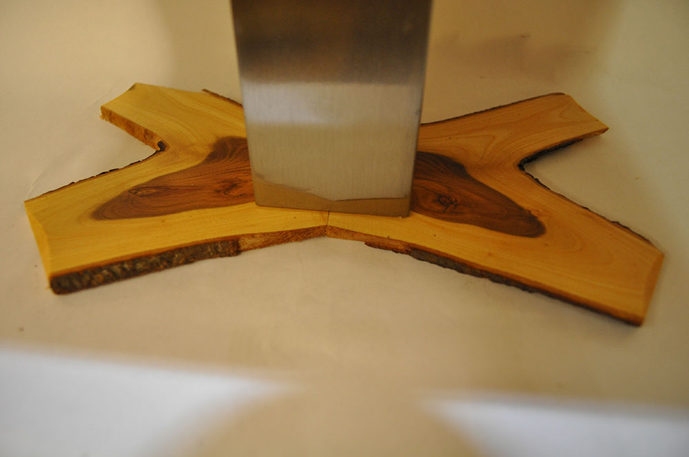 Die Furnier-Spiegelung findet sich auch beim dem Sockel wieder. Eine Edelstahlsäule dient als Tischgestell. Es könnte natürlich auch ein hohler Stamm sein. Als Holzart haben wir Zwetschge gewählt. Der dunkelrote Kern ist einfach brillant. Durch das Nachdunkeln wird der Kontrast noch verstärkt.