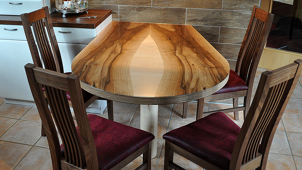 Tisch Sägefurniertisch Nussbaum Ahorn Unikat Lackiert