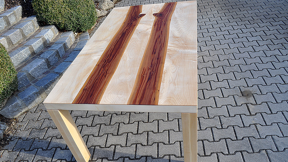 Tisch / Sägefurniertisch Zwetschge Ahorn Unikat Lackiert